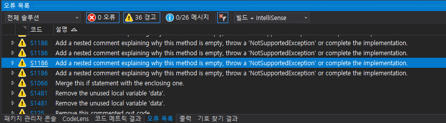 먼저 Sonar Lint를 찾아보니 VS Nuget에 배포되어 있어 바로 설치해봤다.