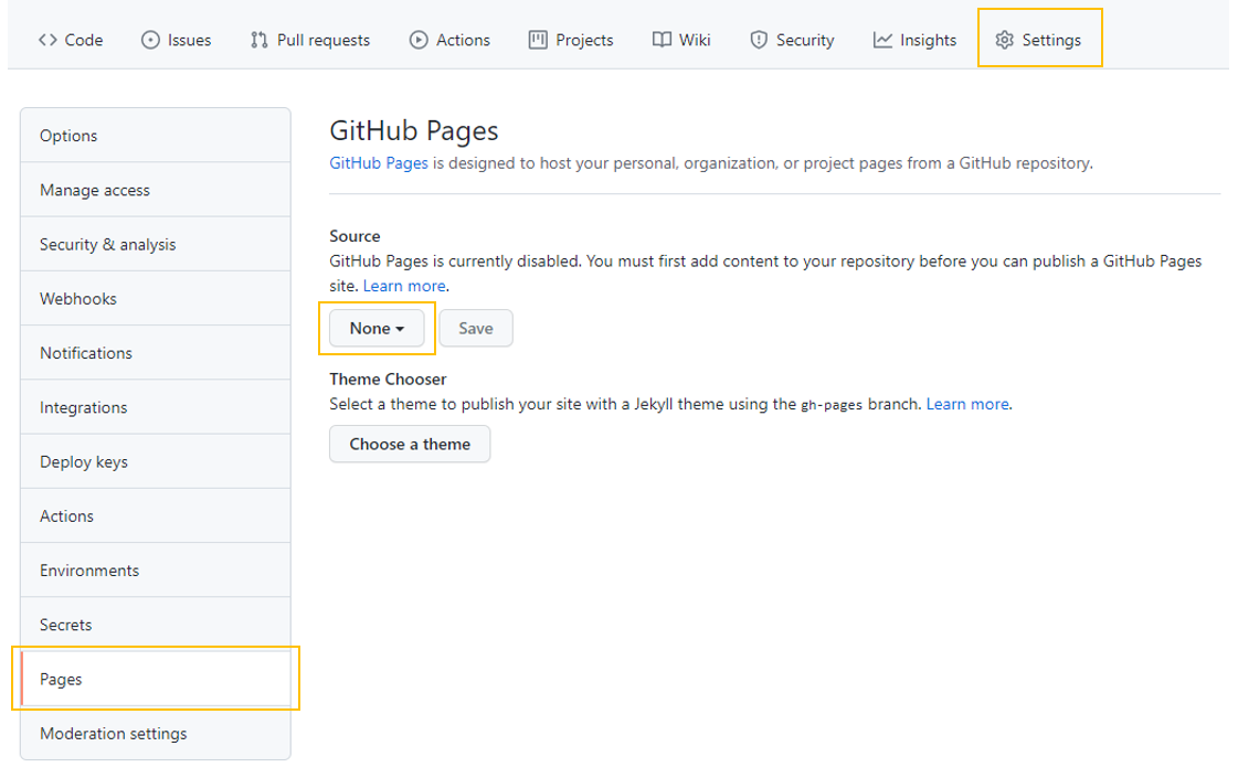 내용물이 Git에 업데이트된 것을 확인한 후 Setting에서 Page 탭으로 들어간다.