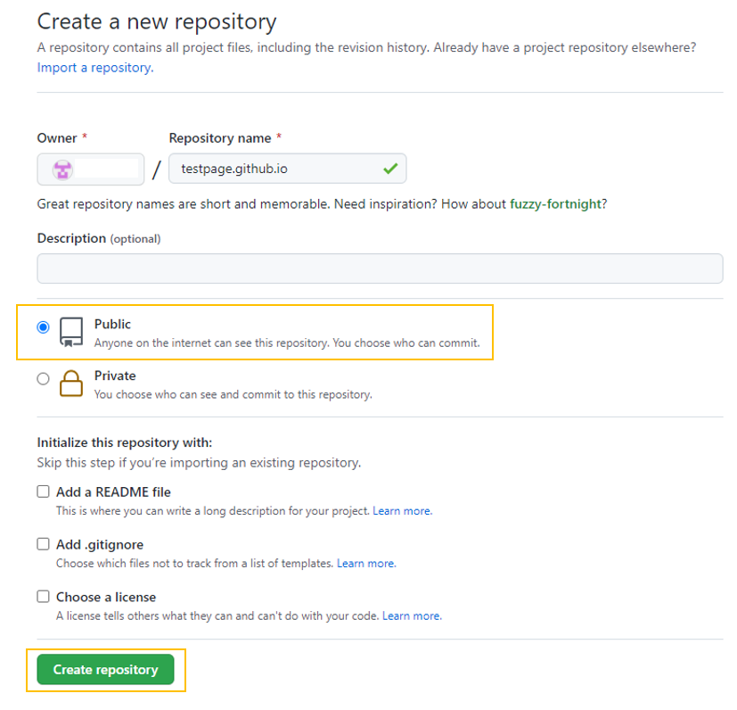 만약 Git 계정 아이디가 testpage 라면 아래처럼 Repository name을 설정하면 된다.